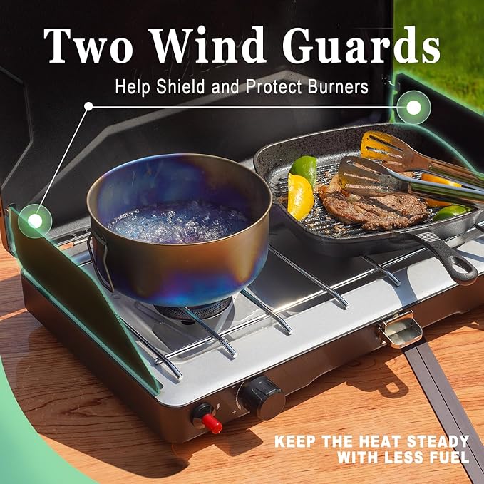- POWERFUL CAMPING STOVE: Propane gas grill features 2 burners on each 10,000 BTU, total 20,000 BTUs of amazing outdoor cooking power. Perfect for preparing steaks, burgers, eggs, bacon, sausage, pancakes, coffee, soup, boil water