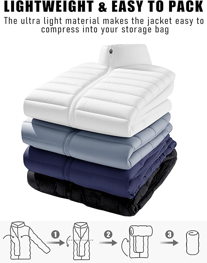 - EASY TO PACK: The ultra light material makes the jacket easy to compress into your storage bag. Hang this puffy coat on your backpack to save space for casual and outdoor travel