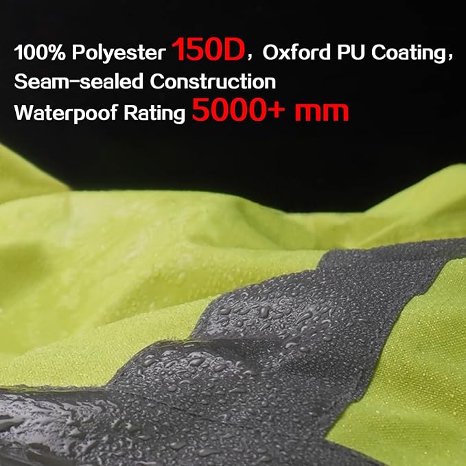 - HIGH VIZ POLYESTER LIGHTWEIGHT STURDY: Polyester 150D,oxford PU coating,Seam-sealed construction, W P 5000 mm used in moderate to heavy rain weather. It is a great choice for people who need to work in rainy or Dark environments.