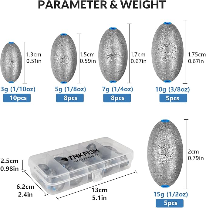 - MIXED GRAMS & 2 SET AVAILABLE: 36PCS:1/10oz(3g)*10pcs, 1/8oz(5g)*8pcs, 1/4oz(7g)*8pcs, 3/8oz(10g)*5pcs, 1/2oz(15g)*5pcs. 21PCS: 1/2oz(15g)*5pcs, 3/4oz(20g)*5pcs, 1oz(30g)*5pcs, 1.4oz(40g)*3pcs, 1.8oz(40g)*3pcs.THKFISH variety sizes of egg lead sinker would satisfy your various usages.