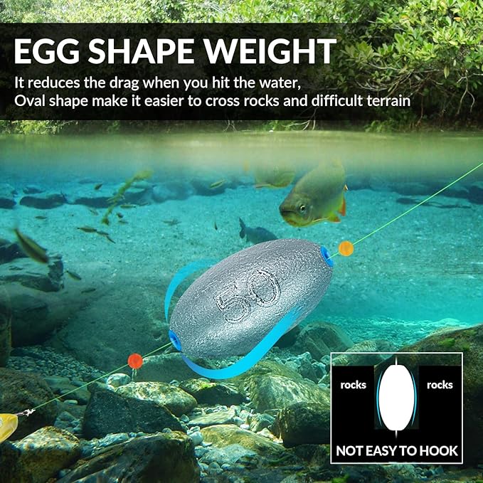 - EXCCELENT EGG LEAD SINKERS: These egg shape weights are widely used in various fishing rigs, such as Texas and Carolina Rigs, Slip Bobber Rig. The egg shape makes these sinkers quite resistant and able to roll along the bottom. The oval weights can make your bait smoothly pass through weeds and rocks and go deep into the place of big fish. It is very suitable for fishing in wild waters with complicated underwater conditions.