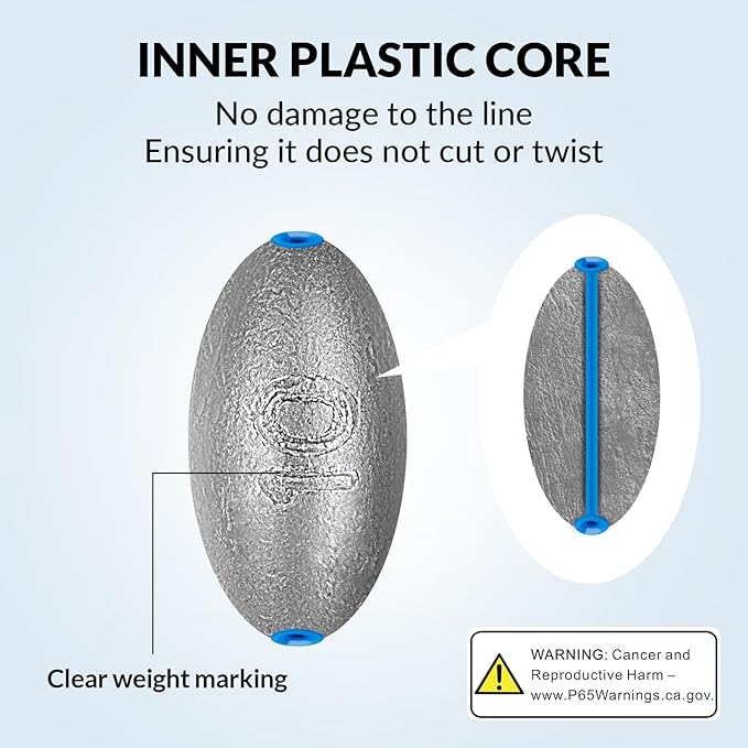 - RELIABLE INNER PLASTIC CORE: The inner plastic core channels of the egg sinker is designed to allow the line to pass through easily and quickly, protecting your line and ensuring it does not cut or twist. The smooth surface on the outside helps reduce air and water resistance, allowing it to drop into the water quickly and sink without disturbing the fish.