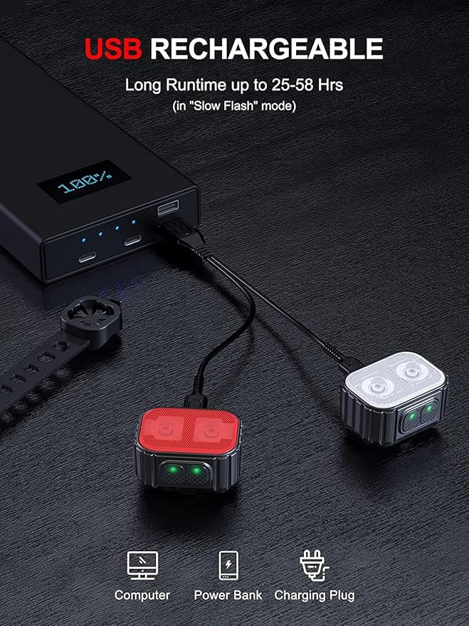 - LONG RUNTIME & BATTERY INDICATOR - Our front light for bikes is equipped with 1100MAH large capacity battery, and the taillight’s is 350MAH. In "Slow Flash" mode, the headlights can last up to 58 hours and the taillight lasts 25 hours. When the battery is below 20%, the indicator on the switch will flash green to remind you to charge the light, never worry about running out of power.
