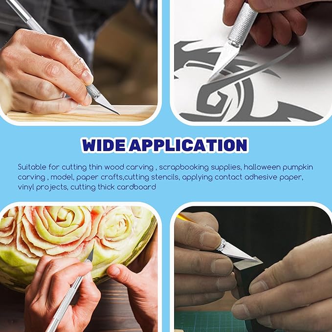 - 【Wide Application】 The hobby precision knife kit perfect for precision cutting, detailed carving and trimming. Suitable for cutting thin wood carving , scrapbooking supplies, halloween pumpkin carving, model, paper crafts,cutting stencils, applying contact adhesive paper, vinyl projects, cutting thick cardboard. With the exacto knife kit, you can create beautiful and intricate designs with ease and precision.
