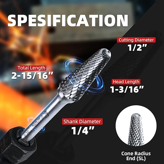 - 【Taper Shaped Radius End】This carbide taper shape rotary burr bit SL-5, Size: 2-15/16" Total length, 1/4" shank diameter, 1-3/16" length of cut, 1/2" head diameter. Can be processed into a variety of high-precision shape mold cavity