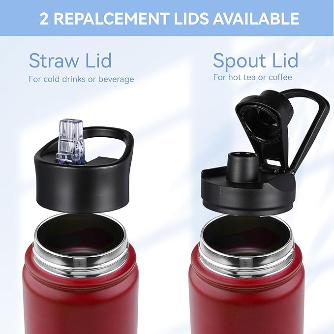 - 【STAY REFRESH THROUGHOUT THE DAY】It's easy to stay hydrated on exciting adventures with such a versatile bottle. Liquid can be fresh in its best taste for a whole day. The straw lid is ideal for cycling, hiking and gym while the spout lid is perfect for beach, camping and hunting.