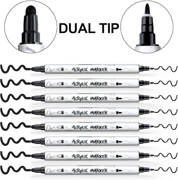 - Transon dual tip acrylic black paint pen 8-pack. Dual tips: one end with 0.7-1mm(approx.) fine tip, the other end with 3-5mm(approx.) bold tip.