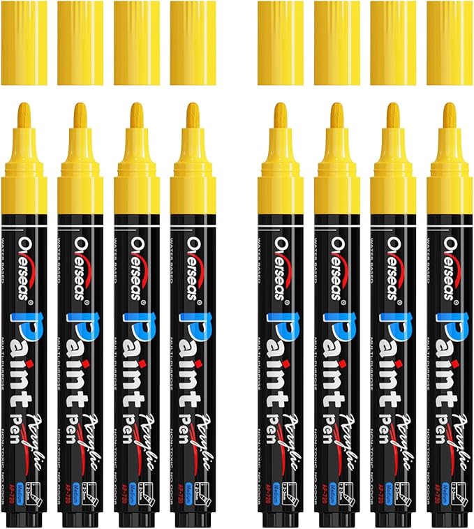 Overseas Yellow Acrylic Paint Markers - 8 Pack Medium Tip Acrylic Paint Pens, Water Based, Quick Drying, Waterproof, Non Toxic Permanent Markers for Rock, Wood, Plastic, Metal, Canvas, Glass, Fabric