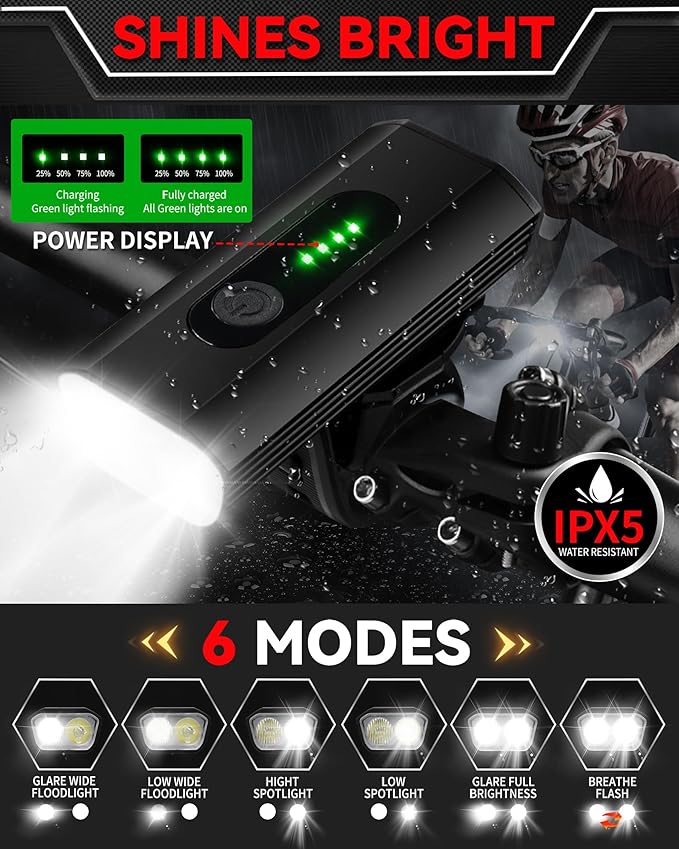 - 〖6 Modes and USB-C Rechargeable Bike Light 〗Easy bicycling and hassle-free. 6 lighting modes bike light (strong light broad, low light broad, high spotlight, low spotlight, strong light full light, flash) to serving your various needs! Powered by built-in rechargeable battery with up to 4-8 hours of battery life. With 4 LEDs power indicator, you would clearly know the power status anytime to minimise the inconvenience of sudden shutdown. Easily charged by mobile power or any USB device.