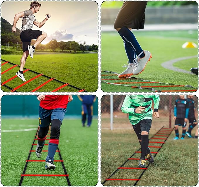 • IMPROVE SPEED, STRENGTH AGILITY TRAINING EQUIPMENT KIT- the speed ladder agility ladder set is perfect for any athlete looking to maximize their potential. Including 12 soccer cones, 4 plastic agility hurdles, a running resistance parachute, a 12 Rung 20ft Agility Ladder with 4 Steel Stakes- the ultimate football agility training equipment set