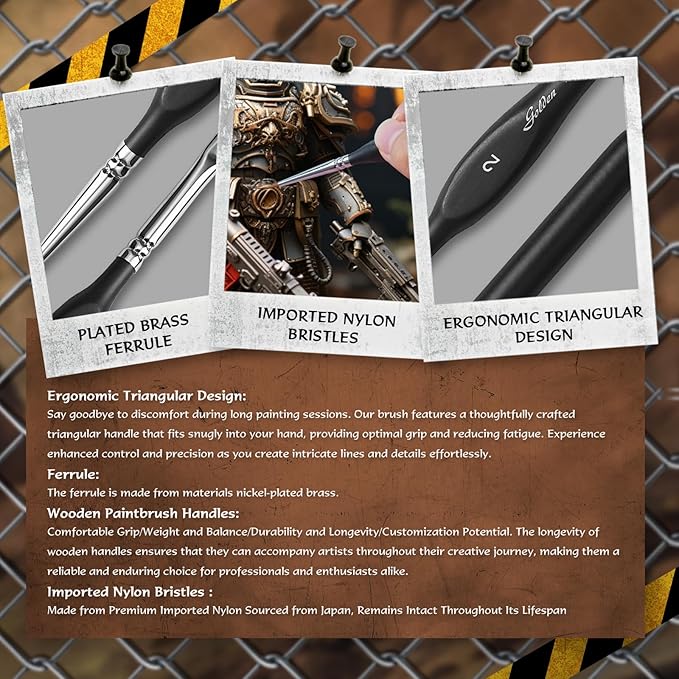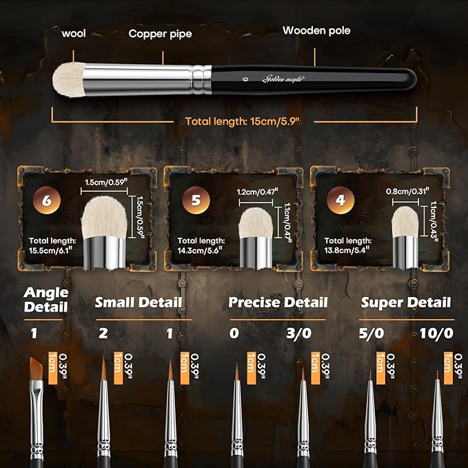 - 【Expressive Potential】7 model paint brushes of different shapes and sizes(Angle 1,Round 0, 1, 2, Liner 3/0, 5/0,10/0 ) and 3 large dry brush, it will satisfy all your needs of detail painting,ensure You're getting the best fine detail brushes for Your Painting. Achieve depth and emphasis in your artwork by utilizing the dry brush's textured backgrounds to highlight focal points that are then further accentuated by the sharp lines from the detail paint brushes.