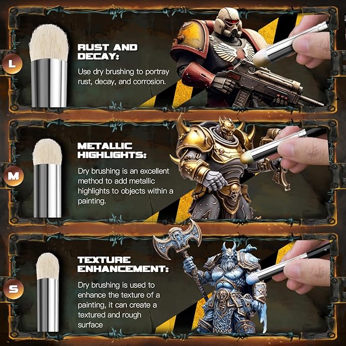 - 【Goat Hair Dry Brushes】Miniature dry brush features rust proof ferrule which encases dense, semi-stiff, and springy goat bristles, as well as a slightly domed shape. Dry brush set are durable and resistant to deformation or shedding, excellent comfort that can be controlled firmly.