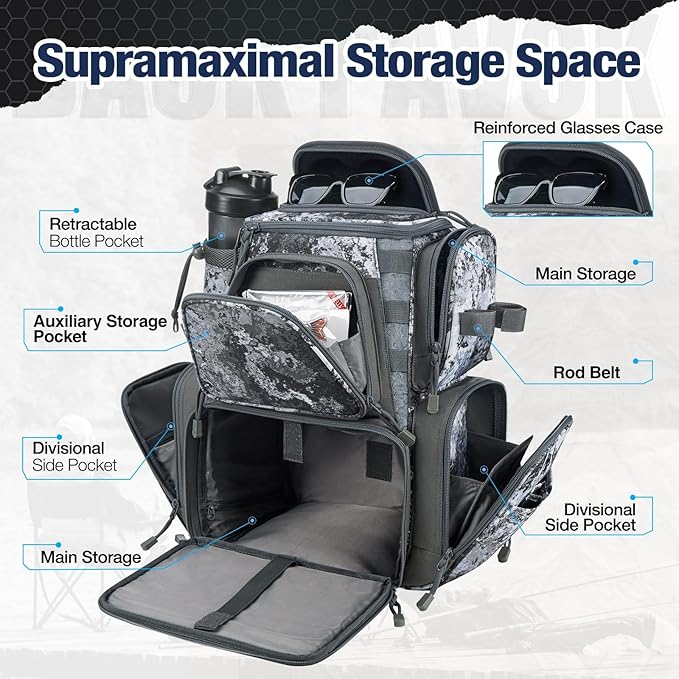 - Feature-Rich & Value-Packed: This fishing tackle backpack includes a protective rain cover, hard-molded sunglasses case, and reinforced KAM buckles with SBS zippers. Offering practical organization and durability, it provides anglers with a versatile and dependable backpack at an affordable price.