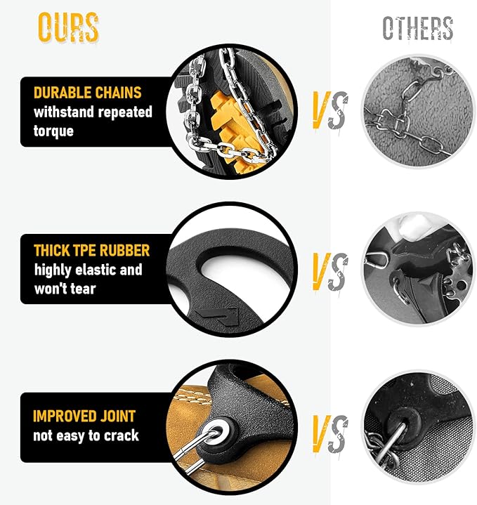 - Enhanced Durability: The Pecube Traction Snow cleats have extra strong connection between metal chains and rubber, through metal grommets so they won't tear easily, enhance the service life of the ice cleats chain grip