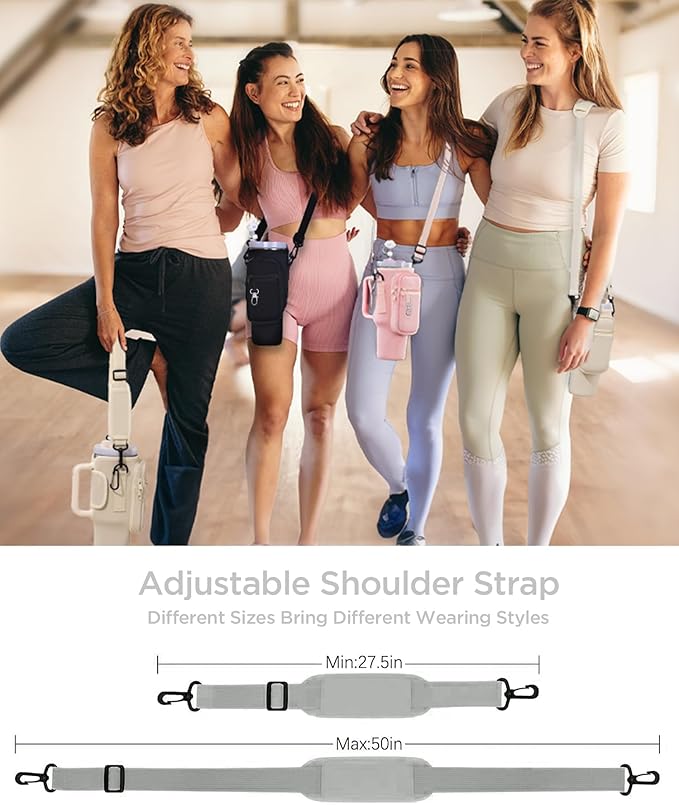 - 【Adjustable Shoulder Strap and Multiple Pockets】For Stanley Quencher 40 oz Cup Sleeve comes with a removable and adjustable padded shoulder strap, the shoulder strap can be easily adjusted between 27.5" and 50" to fit a wide range of body shapes. The water bottle holder for stanley 40 oz tumbler is designed with two front pocket designs that provide plenty of room for all your personal belongings such as smartphones, cash, cards,keys,etc