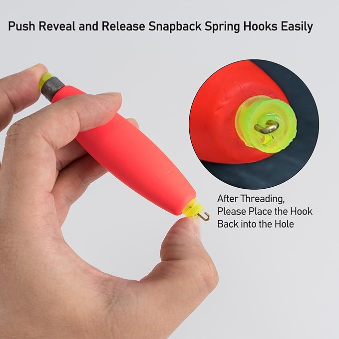 - SNAP-ON FLOATS: Equipped with a heavy-duty spring fixed design, the top and bottom spring hooks can be easily pushed open and release closed, allowing for quick and easy depth setting, keeping the hook and bait at the required depth.