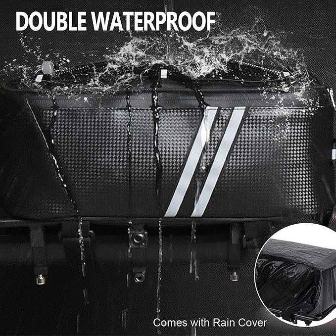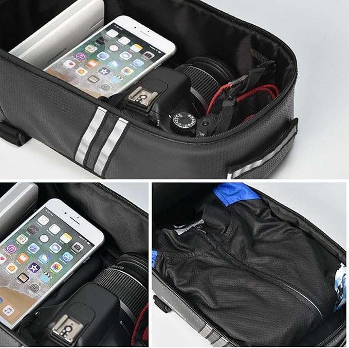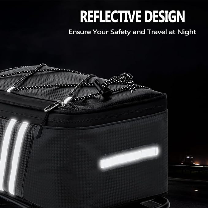 - 【Capacity and Convenient 】 The bike rack bag is equipped with a 8L main compartment, top zippered pockets to help organize your essentials. The top adjustable bungee cord design increases your storage capacity and can help you tie various items such as bottles, clothes, umbrellas and more.