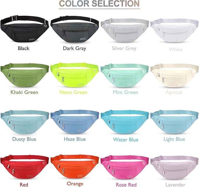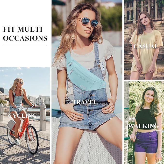 - Changeable Style Fanny Pack,Many Ways to Wear — Since the comfortable long strap is widely adjustable for most waist size(20” - 50”).There are many ways to wear this fanny pack - You can wear it in front of your waist, as a belt bag,back on your hip, slant across your chest or over You shoulder.Perfect for various occasions.