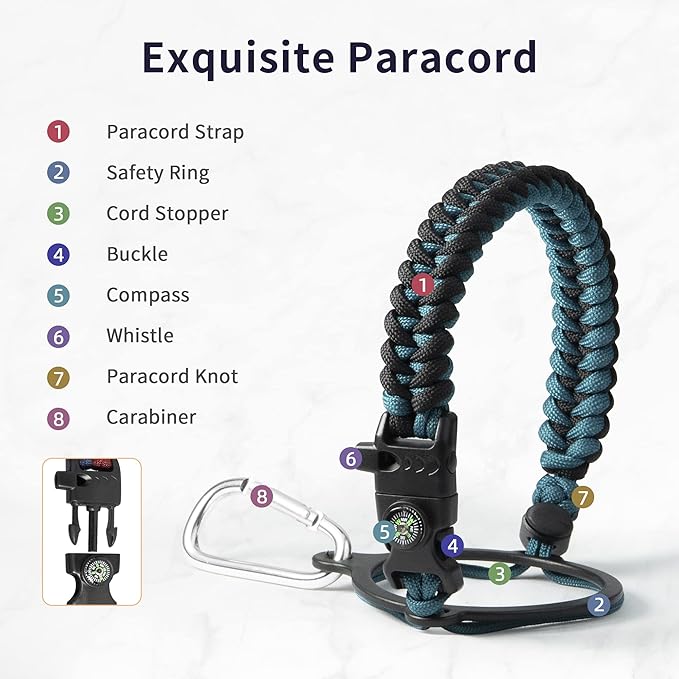 - Full-function Paracord: Brilliant paracord of matching colors bring out the bottle with a touch of youthful vibe. Compact compass and handy carabiner make the bottle the ideal survival kit for expeditions in the wild.