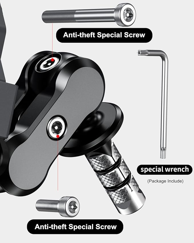 - Protect Mobile Phone Holder Design: The double socket arm & fork stem mounting base are equipped with special safety screw. The package comes with a special wrench to tighten the safety screw. This design keeps your phone holder from being easily removed. Note: The anti-theft design is to ensure that the mobile phone mount is not easily removed, not an anti-theft design for mobile phone