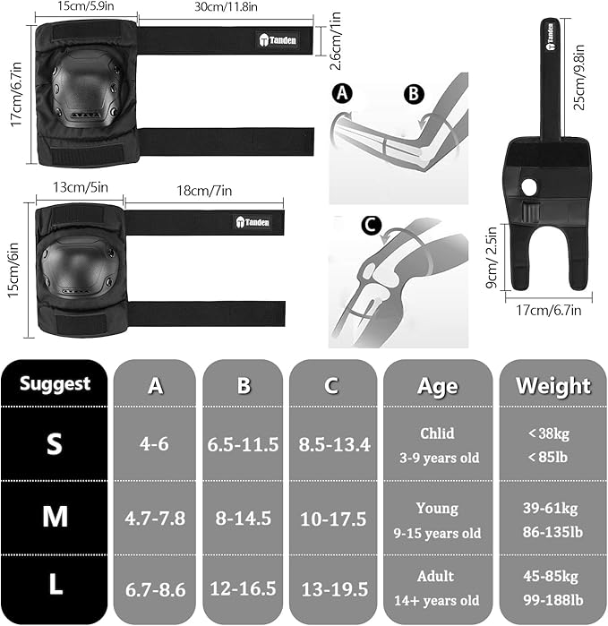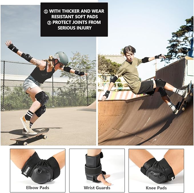 - Adjustable Size - Our medium size is best suited for youth aged 9 to 15 years old. Equipped with several adjustable, elastic straps for a customizable fit, this youth skateboard pads guarantees unrestricted movement during sports.