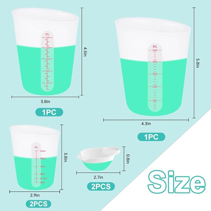 - 【Silicone Measuring Cup Set】 Silicone measuring cup set: 1 500ml epoxy mixing cup, 1 250ml silicone measuring cup + 2 125ml resin mixing cups + 2 10ml silicone cup dispensers, the clever combination allows you to flexibly use resin or DIY Job switching.