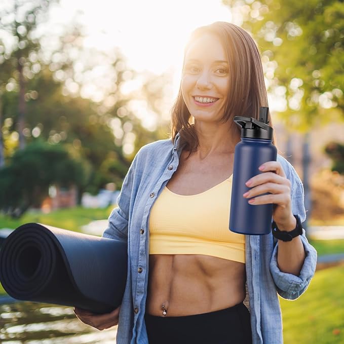DOMICARE 32 oz Insulated Water Bottle Bulk, Vacuum Insulated Stainless Steel Sports Water Bottle with Straw Lid & Spout Lid, Leakproof, Reusable - Travel, Camping, Bike, Navy Blue (4 Pack)