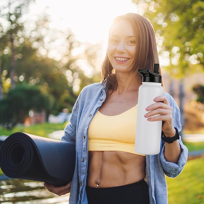 DOMICARE 40 oz Insulated Water Bottle Bulk, Vacuum Insulated Stainless Steel Sports Water Bottle with Straw Lid & Spout Lid, Leakproof, Reusable - Travel, Camping, Bike, White (4 Pack)