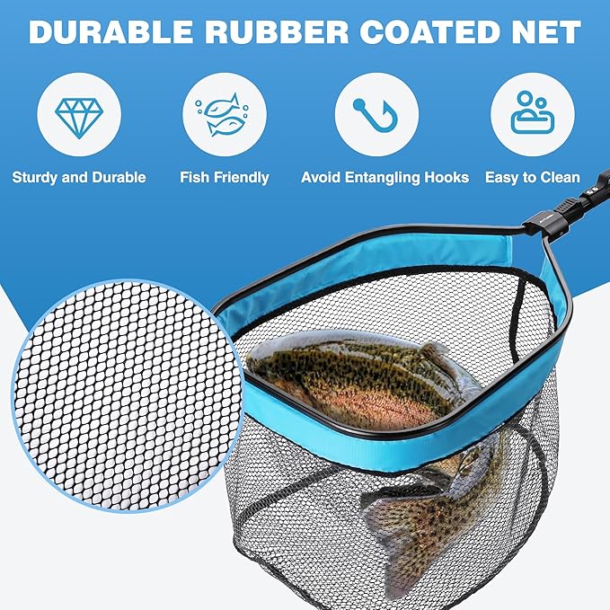 - Solid and Fish-Friendly Mesh: Our fishing net boasts a robust rubber-coated mesh that is gentle on fish and facilitates easy hook removal. The easy-to-clean and durable rubber-coated net is an effective tool for landing trout, koi and other fishes