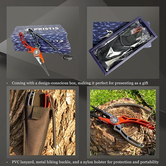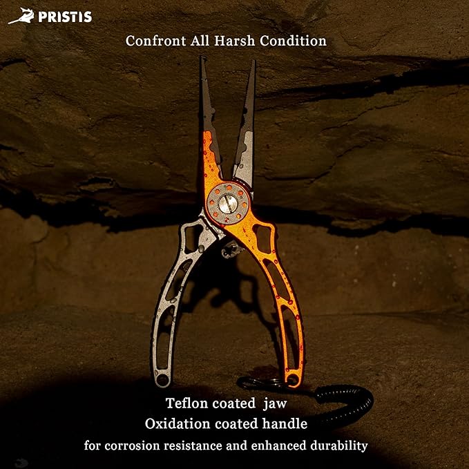 - 🎣【Dependable tackle with an extended duration】: Pristis plier is made of 2CR13 stainless steel at the jaw with a Teflon coating for corrosion resistance. The handle is made of aerospace grade aluminum alloy with an oxidation coating for enhanced durability and lightness. The plier is die-cast and cut by CNC precision processes, making them ideal fishing tackles for freshwater and saltwater.