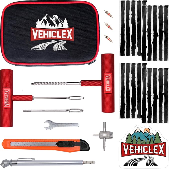 Vehiclex Tire Repair Kit for Plug and Patch with Aluminum Handled Tools - Emergency Kit in Zippered Bag for Car, Motorcycle, ATV, Tractor, Lawn Mower