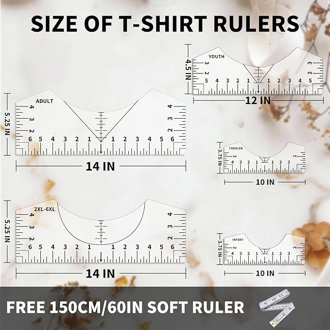 - ✂️【Meet Different Needs】The rulers comes with 4 Styles, they are applied to all kinds size: Adult, Youth, Children and V-Neck. The rulers have advanced UV printed graduated numbers and marks that are clearly visible on the ruler guide, they are easy to read against almost any shirt color. Measurement has made easier by inch marks on both side of this shirt measurement tool for vinyl set.