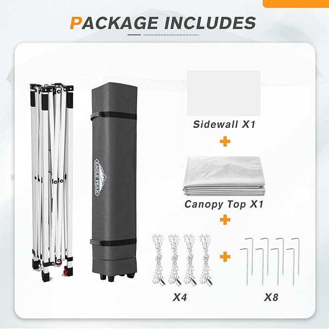 - ROLLER BAG & STABILITY FEATURES: This quick setup canopy kit is designed for convenience and durability, featuring a wheeled carry bag for easy mobility. To enhance stability, it includes 4 guy ropes and 8 steel stakes, perfect for securing the tent during outdoor events, camping trips, patio setups, or backyard gatherings.