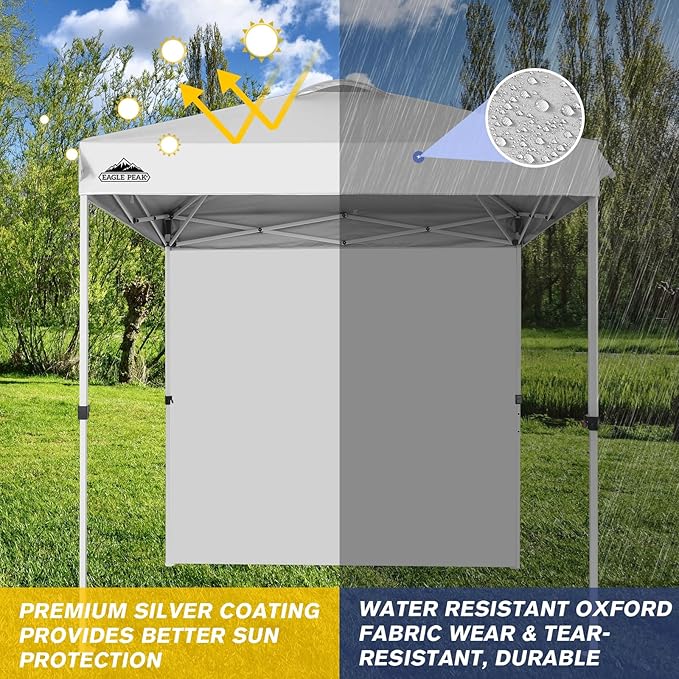 - DURABLE & SPACIOUS: This EAGLE PEAK event canopy provides shade for 3-6 people. Adjust the peak height easily with the pinch free leg release. Built with a powder coated steel frame and hardened through bolts, it ensures lasting durability. The coating resists rust and corrosion, making it an ideal event shelter for farmers' markets, the beach, parties, festivals, and sports events.