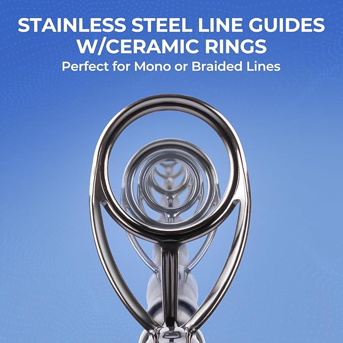 - Stainless Steel Guides w/O-Rings – Strong and durable stainless-steel guides are used on all models with premium O-ring inserts that perform perfectly with both mono or braided lines. The lightweight stainless frames look great and keep the weight down for a perfectly balanced rod blank.