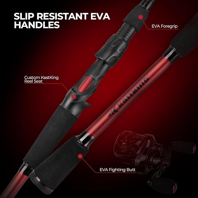 - Smooth Casting & Comfortable: Stainless-Steel guides and Titanium Oxide Ceramic Rings reduce friction, allowing for long casts and reliable performance. Custom KastKing Reel Seats, EVA handle, fighting butt, and foregrip provide a comfortable and secure grip, allowing anglers to fish for hours without fatigue.
