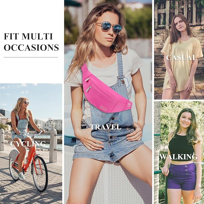 - Changeable Style Fanny Pack for Women,Many Ways to Wear — Since the comfortable long strap is widely adjustable for most waist size(20” - 50”).There are many ways to wear this fanny pack - (1)As a Waist Belt Bag:Wear it in front of your waist (2)As a Hip Pack:Back on your hip (3)As a Shoulder Fanny Pack or a Sling Fanny Pack:Slant across your chest or over You shoulder.Perfect for various occasions.