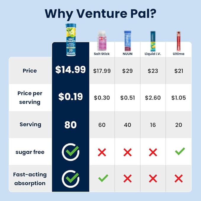 - TAKE HYDRATION ON-THE-GO: Venture Pal's electrolyte tablets are perfect for active lifestyles, from gym sessions to hikes or busy days. Compact and convenient for athletes like runners, cyclists, and golfers, they fit easily in your bag—or even make great stocking stuffers this holiday season