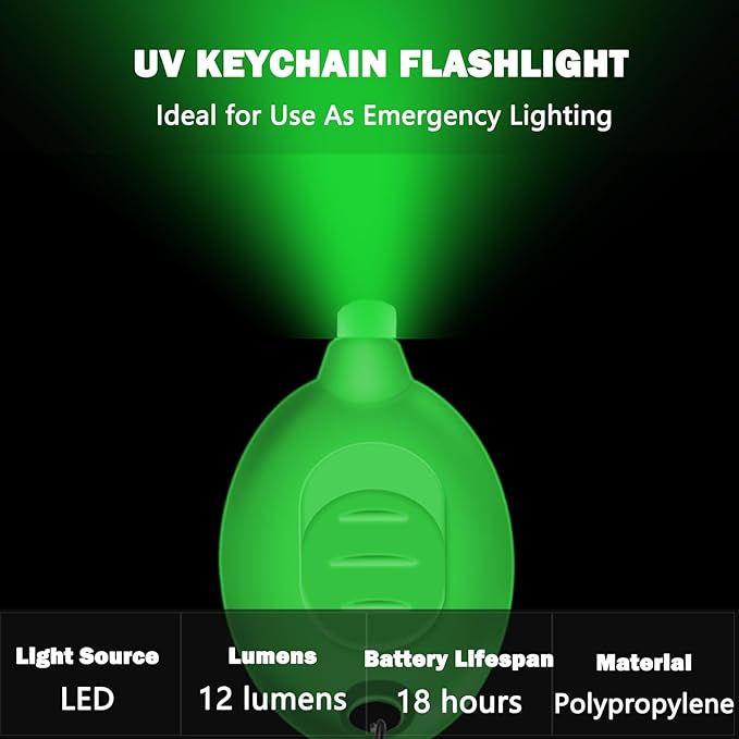 - Vivid Green Illumination On-the-Go: Experience the brilliance of our ultra-bright Green LED keychain flashlight, delivering 12 lumens of vivid Green light. Perfect for emergency situations, it provides a discreet yet powerful source of illumination. Whether you're navigating in the dark or observing nocturnal wildlife, this keychain light has you covered.