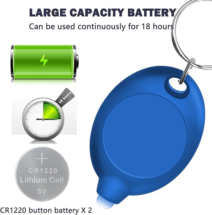 - Long-lasting: Powered by 2 CR1220 battery, our mini Blue keychain flashlight ensures extended use. With up to 18 hours of continuous illumination, you can rely on this compact companion.