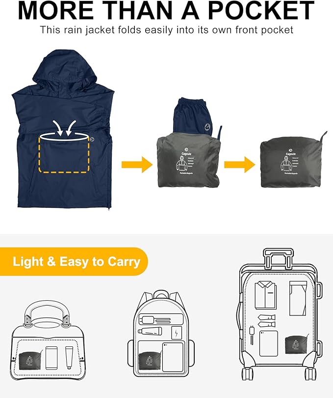 - LIGHTWEIGHT & PACKABLE: The lightweight pullover rain jacket mens folds easily into its own front pocket. Convenient and compact to minimize space usage. You can always carry a perfect raincoat with you when the weather is unpredictable.