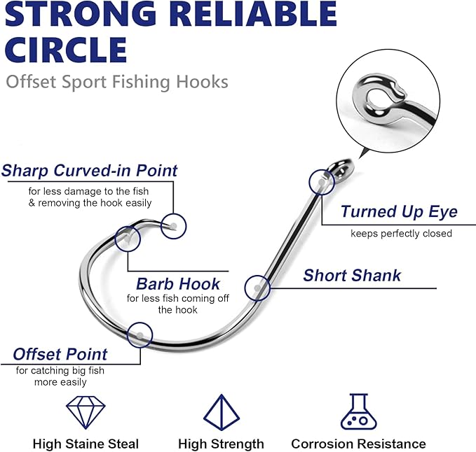 - ► Premium Quality --- Made of premium high carbon steel, our circle hooks saltwater with double strength and corrosion resistance will last a long time on sharpness and help you catch a lot of fish. Stunning circle hooks for catfish bring you a successful fishing day