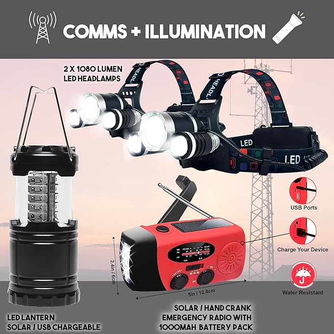 - Effective Communication and Safety Measures: Stay informed and connected with Upgraded 5 Watt 2 Way Radios and a 2000mAh Emergency NOAA Radio. Illuminate your surroundings and beckon for assistance with the Upgraded LED COB Solar Lantern. Prioritize safety with the comprehensive 184 Piece First Aid Kit.