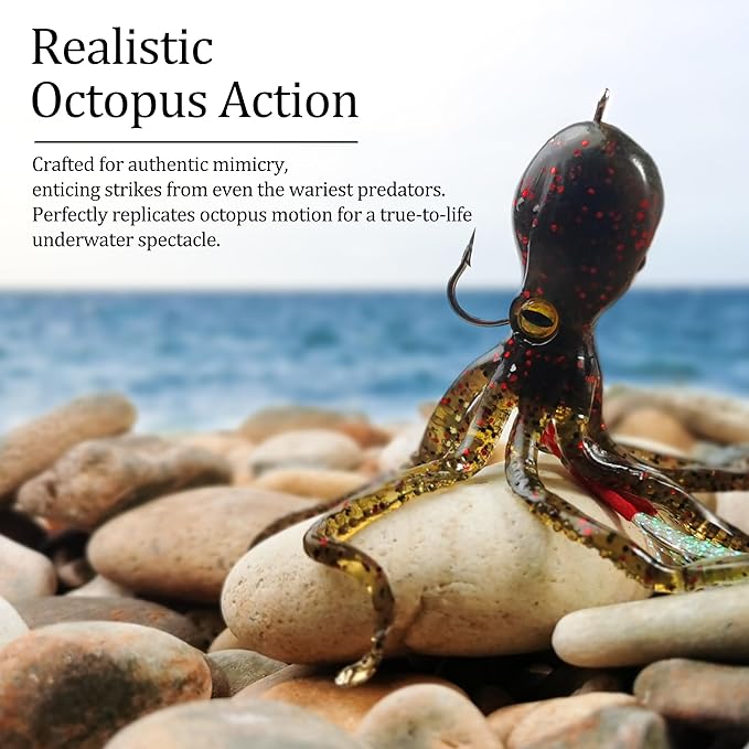 - 【Deadly Attraction Bionic Octopus Lures Kit】VMSIXVM saltwater octopus lures made of ultra realistic soft material which provide incredibly lifelike, vivid action and features a squid foot with lifelike swim. Simulation tentacles design, dancing wildly in the water, while the moving tentacles perform lifelike actions on the retrieve and the drop like a real octopus, which make it attract more catches and provoking predator fish to strike.