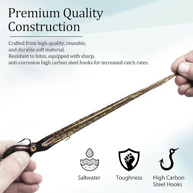- 【Pre Rigged High Resist Octopus Swimbaits】VMSIXVM squid skirt lures made of ultra durable soft plastic, this squid trolling lure can withstand even the most aggressive fish, effectively extend the use time of your squid lures. Pre-rigged with ultra sharp weight hook and double assist hooks. The added weight hook helps octopus bait dowm to fish zone, high carbon steel hook delivers unrivaled sharpness, hook penetration, enough to catch more, prevent fish from fleeing.