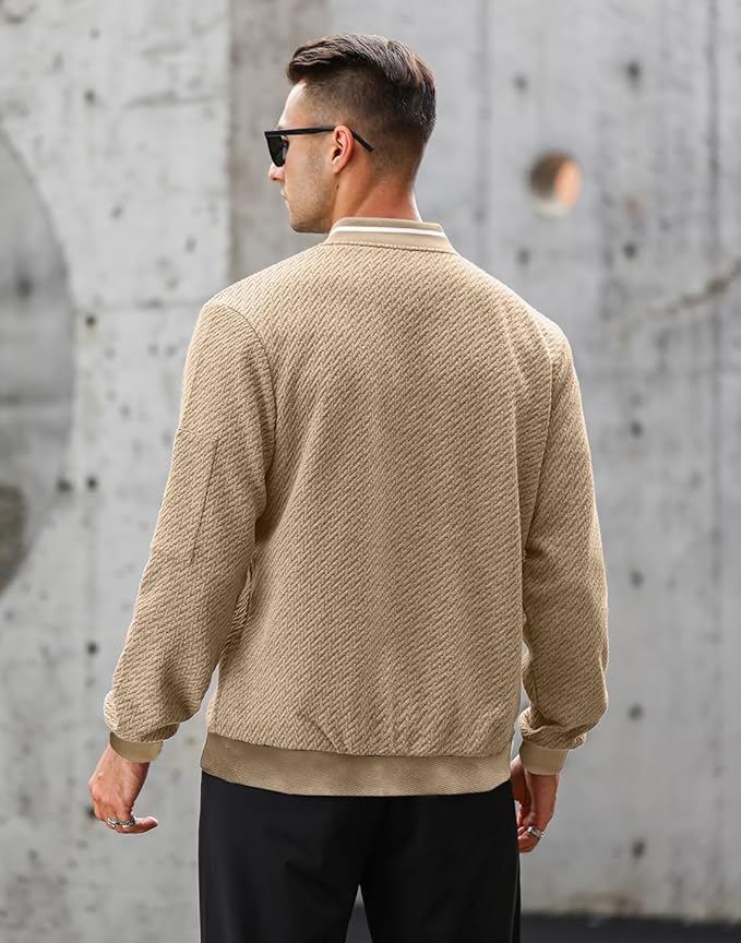 - 【STYLISH DESIGN】: Mens Casual Jacket designed with a full zip, ribbed hem and cuffs, left arm with decorative zipper and 2 side pockets on the front. Featured with V-shaped pattern solid jacquard design, selected clear textured fine fabric, giving this jacket stylish and unique sense.
