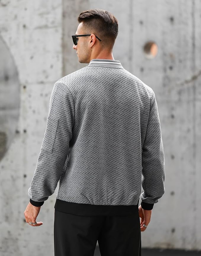 - 【STYLISH DESIGN】: Mens Casual Jacket designed with a full zip, ribbed hem and cuffs, left arm with decorative zipper and 2 side pockets on the front. Featured with V-shaped pattern solid jacquard design, selected clear textured fine fabric, giving this jacket stylish and unique sense.