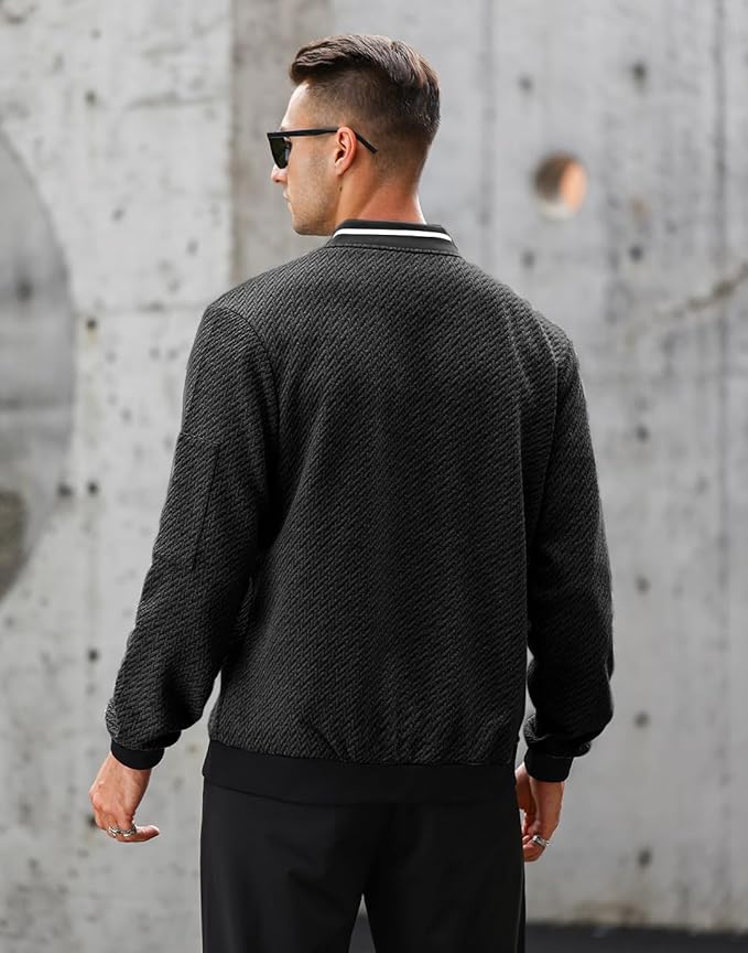 - 【STYLISH DESIGN】: Mens Casual Jacket designed with a full zip, ribbed hem and cuffs, left arm with decorative zipper and 2 side pockets on the front. Featured with V-shaped pattern solid jacquard design, selected clear textured fine fabric, giving this jacket stylish and unique sense.