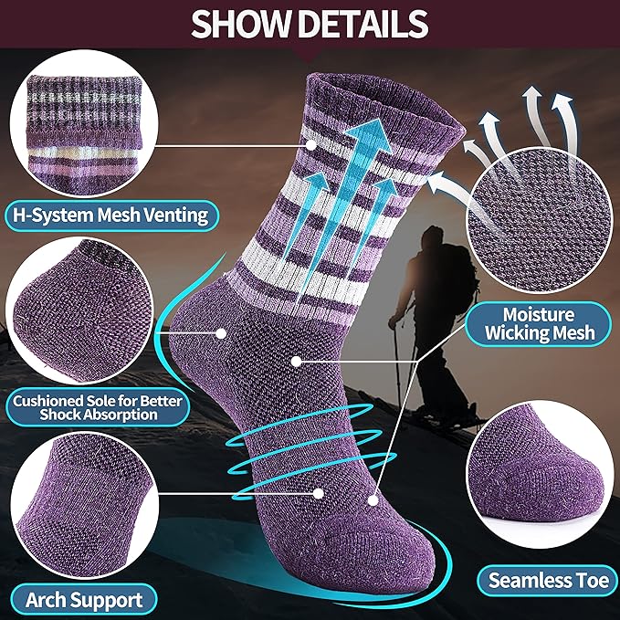 - Protection for Feet:These womens wool hiking crew socks have stretchy cuff and arch support ,which can improve the blood circulation and keep socks fit snugly.Cushion foot absorbs shock and reduces risk of blister.All of these provide more protection for women’s feet.