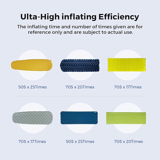- ➤【Powerful Inflation and Deflation】-Don't let its compact size fool you - our air pump is packed with power! Equipped with a small but robust motor, it can quickly inflate your sleeping pads in about 50 seconds. Plus, it operates quietly with a noise level as low as 68 decibels, so you can enjoy a peaceful and comfortable inflation experience